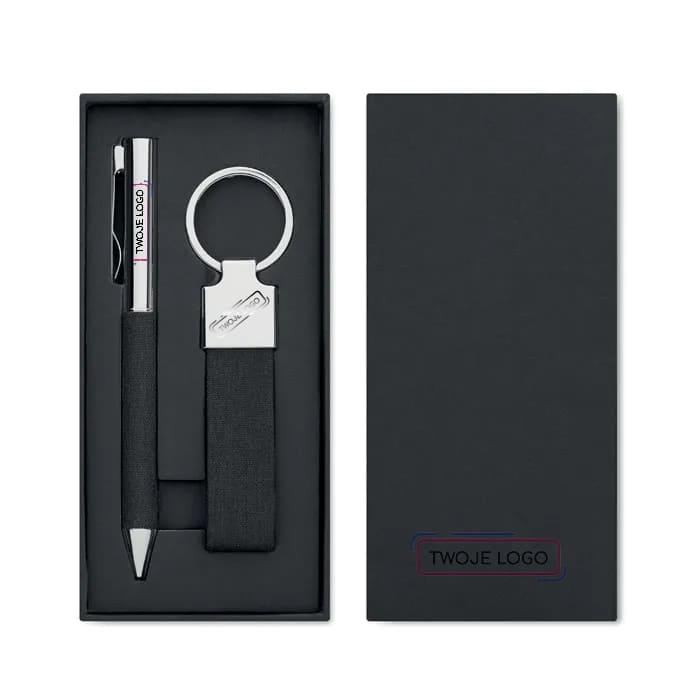 2-częściowy zestaw upominkowy w pudełku. Zawiera metalowy wykręcany długopis z detalami z poliestru RPET i brelok z poliestru RPET. Niebieski tusz.