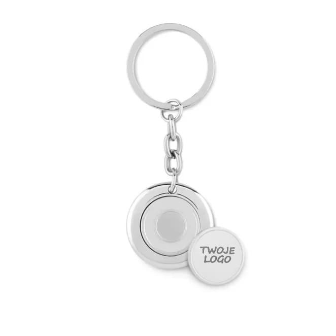 Okrągły metalowy brelok z żetonem.