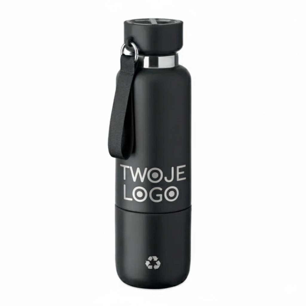 Dwuścienna izolowana butelka wykonana w 90% ze stali nierdzewnej pochodzącej z recyklingu i w 10% ze stali nierdzewnej, ze zintegrowanym uchwytem z paskiem i dodatkowym długim paskiem (70 cm) w pokrywie z PP. Nie przecieka. W zestawie dolny kubek. Pojemność: 500 ml.