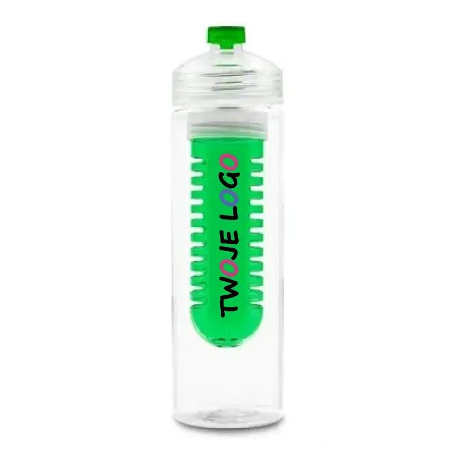 Butelka sportowa 650 ml, posiada pojemnik na lód lub owoce umożliwiający nadanie wodzie smaku według własnych preferencji, zakrętka z kolorowym zamknięciem, butelka przeznaczona wyłącznie do zimnych i niegazowanych napojów, produkt wykonany z plastiku