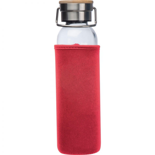 Szklana butelka o pojemności 600 ml, z pokrywką ze stali nierdzewnej i bambusowym zamknięciem. Butelkę przed uszkodzeniami chroni neopropanowe etui.