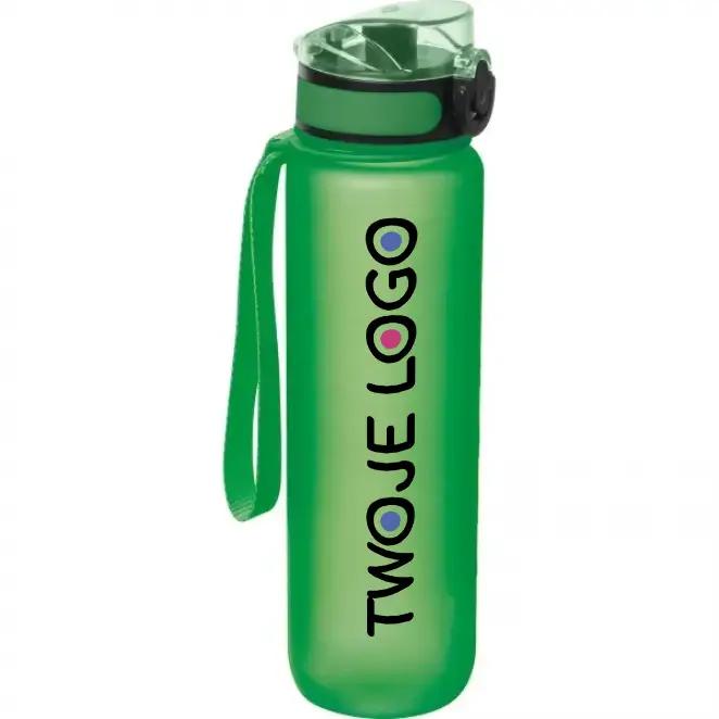 Szczelna, nie zawierająca BPA, sportowa butelka do picia wykonana z tritanu, z zamykaną pokrywką, paskiem na rękę. Pojemność 1000 ml.