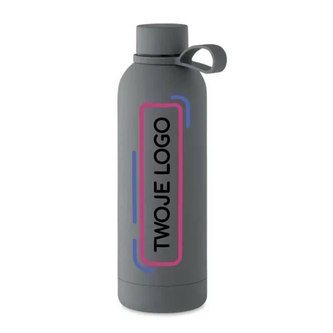 Dwuścienna butelka z izolacją próżniową z recyklingowanej stali nierdzewnej (90% z recyklingowanej stali nierdzewnej i 10% ze stali nierdzewnej) z gumowym wykończeniem i silikonowym uchwytem. Pojemność: 500 ml.