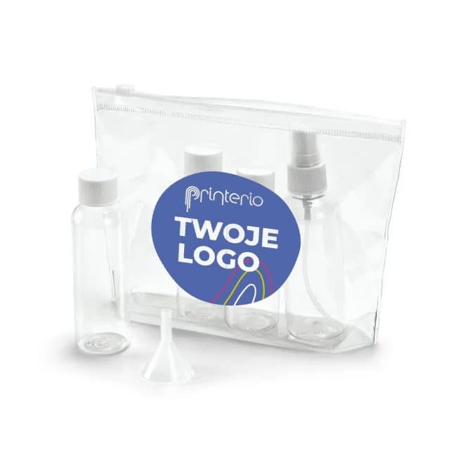 Hermetyczna kosmetyczka wykonana z PVC. Zawiera 3 butelki (2 x 65 mL i 60 mL), 1 atomizer (80 mL) i 1 lejek. Nadaje się do samolotu. 190 x 155 x 40 mm