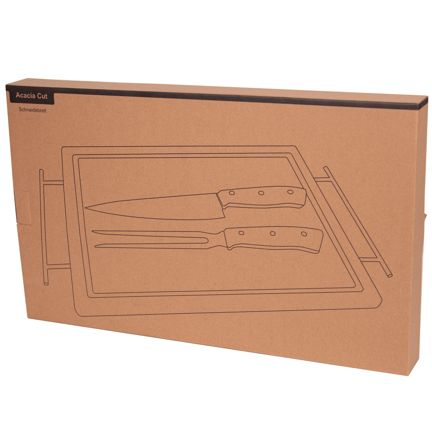 Deska do krojenia ACACIA CUT. Posiada praktyczne wyżłobienie wzdłuż krawędzi i metalowe uchwyty. Zawiera również nóż i widelec wykonane ze stali nierdzewnej z uchwytami z drewna akacjowego.