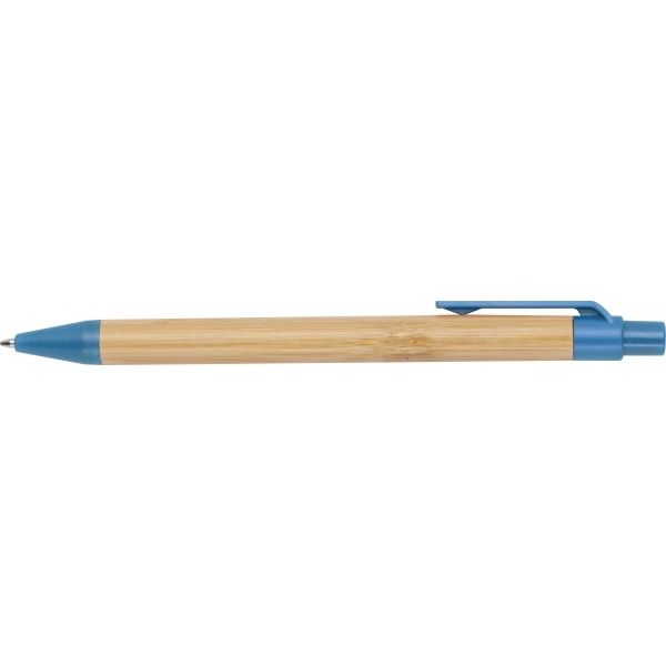 Długopis wykonany z bambusa z kolorowymi elementami wykonanymi z włókna pszenicznego. Posiada klikany mechanizm i wkład w kolorze niebieskim.