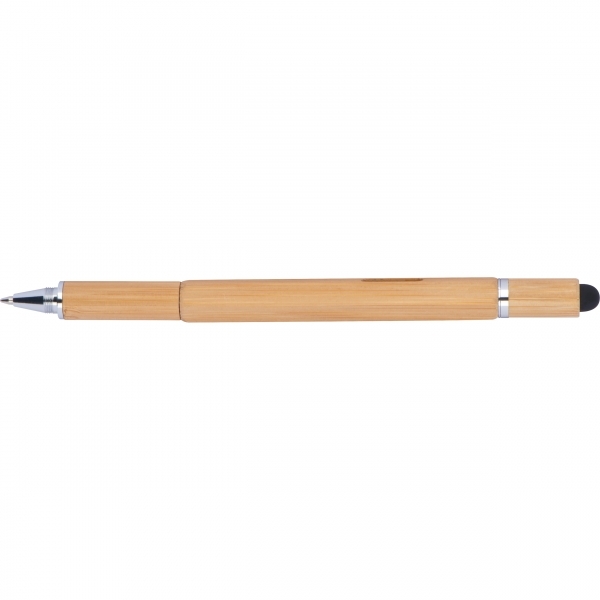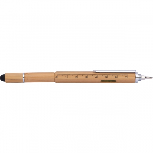 Praktyczny wielofunkcyjny długopis 6w1 wykonany z bambusa z następującymi cechami: przekręcany długopis z czarnym wkładem systemowym, linijka, poziomica, śrubokręt płaski i krzyżakowy oraz pióro dotykowe.