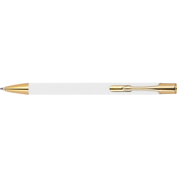 Długopis metalowy soft touch ze złotymi elementami i wkładem piszącym na niebiesko.