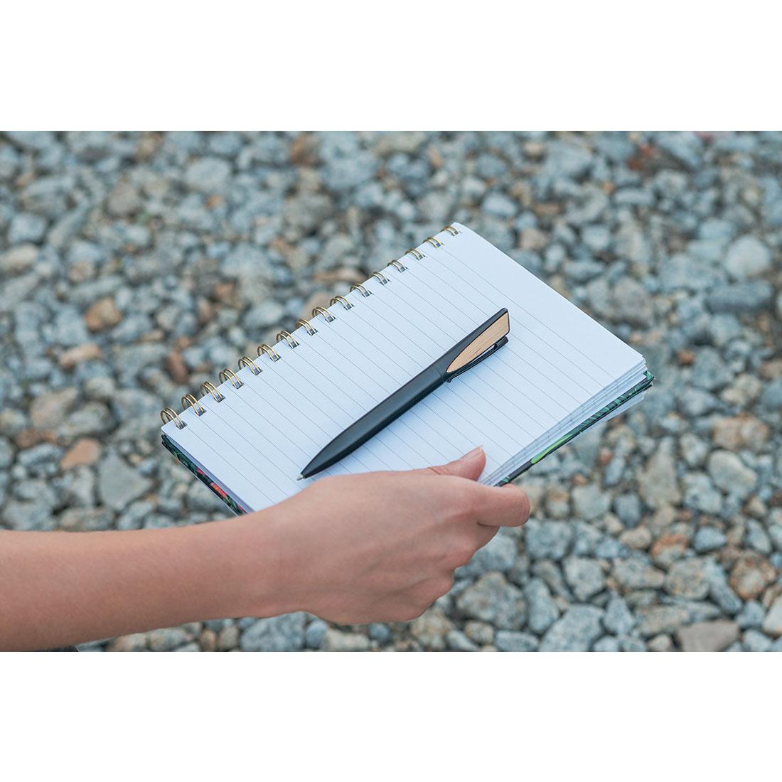 Matowy, przekręcany długopis wykonany z metalu z bambusowymi akcentami. Posiada niebieski wkład.