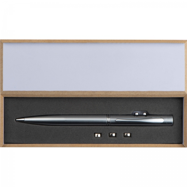 Metalowy wskaźnik laserowy, lampka LED i piszący na niebiesko długopis w jednym. Produkt zapakowany w fornirowane pudełko, zawiera baterie.