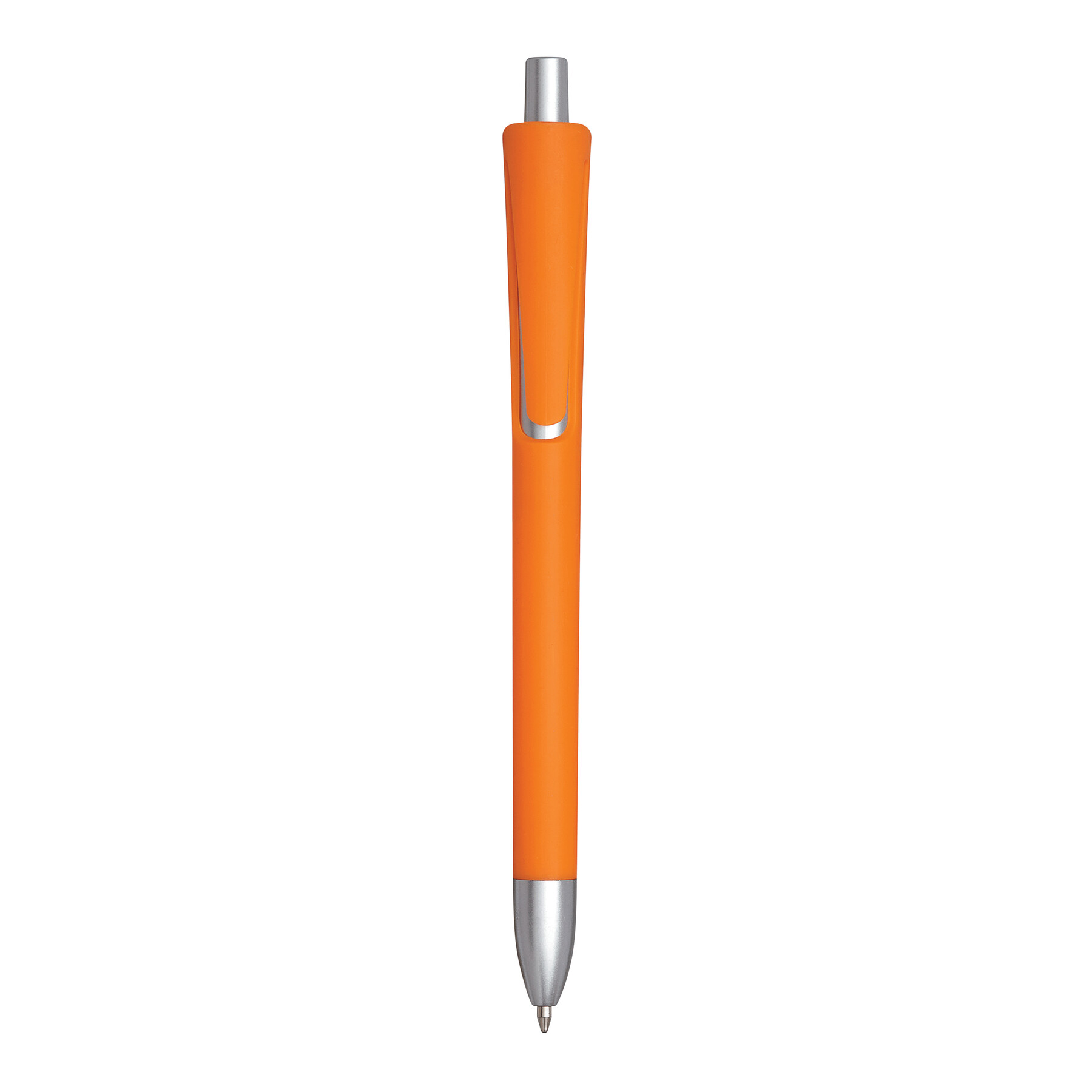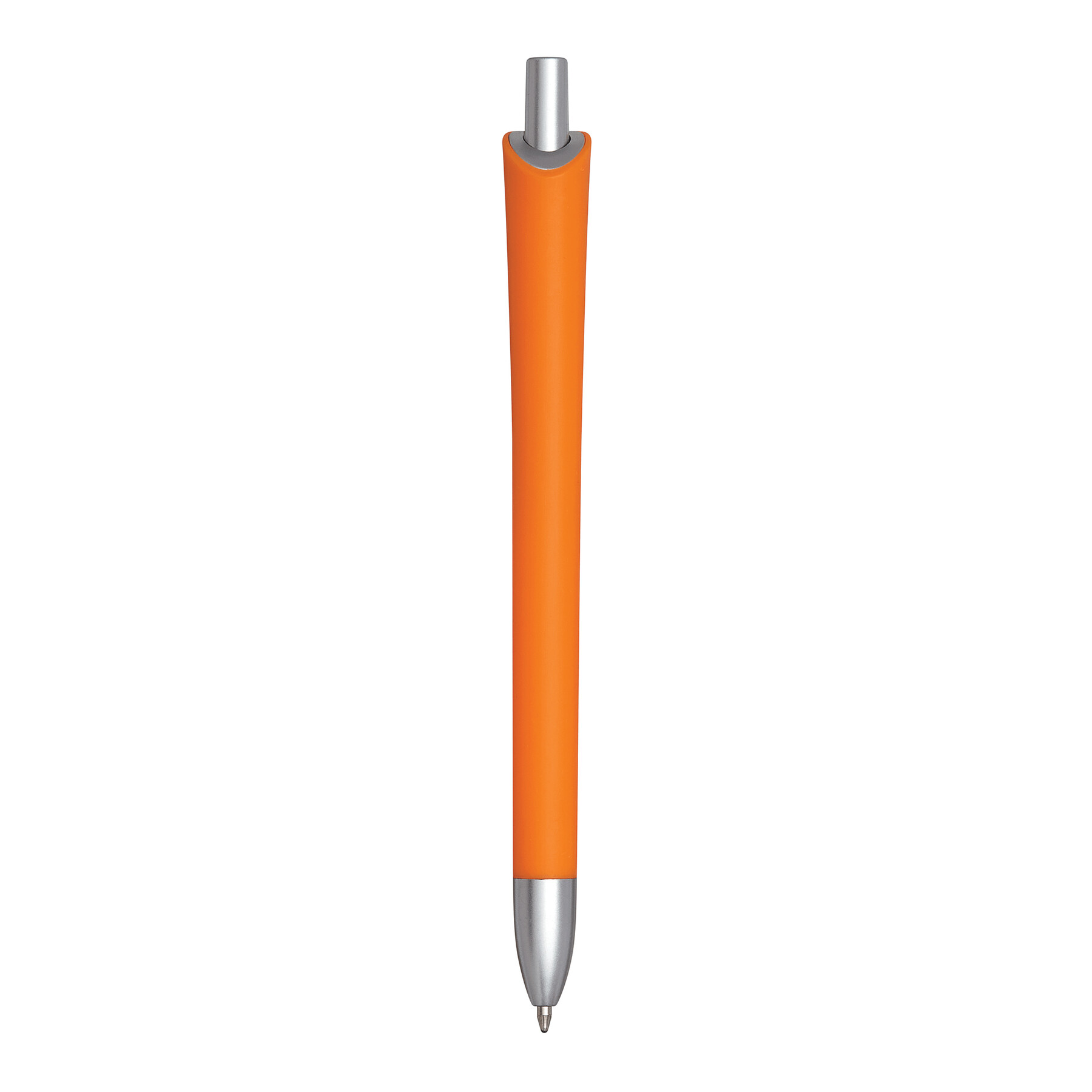 Długopis OREGON z mechanizmem przyciskowym, trzonkiem z tworzywa sztucznego, matowo-srebrnym akcentem pod klipem, na przycisku i obsadce, długość pisania około 800 - 1000 m, czarny tusz.