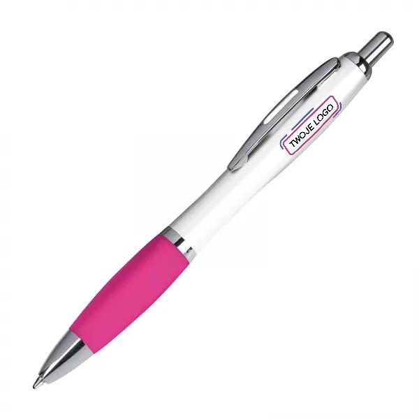 Długopis plastikowy z białym korpusem i kolorową gumką ułatwiającą trzymanie. Wyposażony w metalowy klips i duży wkład piszący na niebiesko.