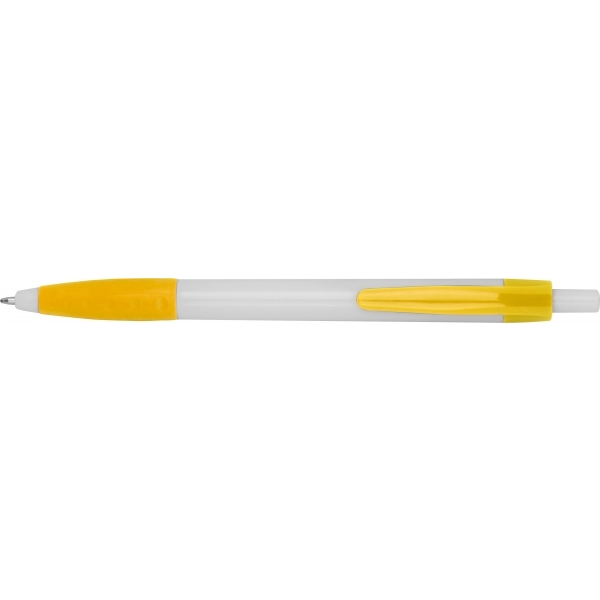 Plastikowy długopis z kolorowymi akcentami i gumową strefą chwytu. Posiada wkład piszący na niebiesko.