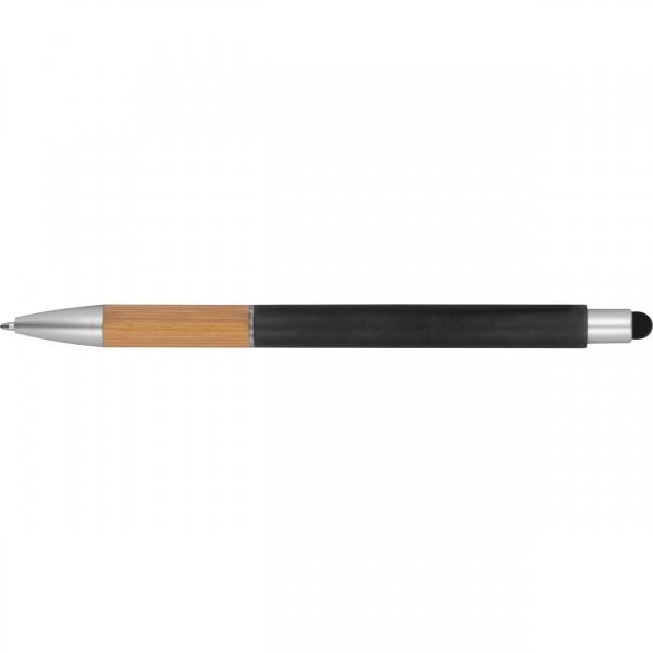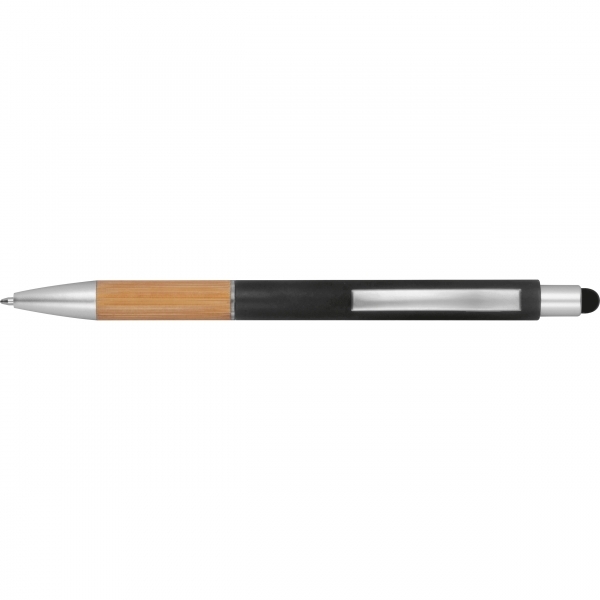 Długopis wykonany z plastiku z bambusową strefą uchwytu, funkcją touch pen do obsługi ekranów dotykowych. Długopis podsiada wkład piszący na niebiesko.