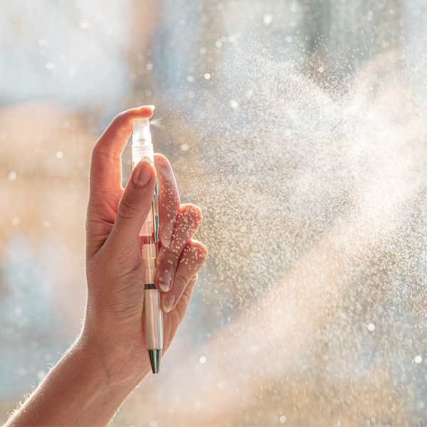 Plastikowy długopis z przekręcanym mechanizmem i wkładem piszącym na niebiesko, posiada atomizer do płynu dezynfekującego lub perfum.