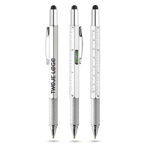 Wielozadaniowy długopis dla każdego fana majsterkowania. Gadżet wyposażony jest w dwie miarki (centymetry i cale) umieszczone na korpusie oraz małą poziomicę. Natomiast pod nakrętką z touch penem znajduje się dwustronny śrubokręt mocowany za pomocą magnesu - poręczny i wygodny w użyciu. Znakowanie możliwe na korpusie.