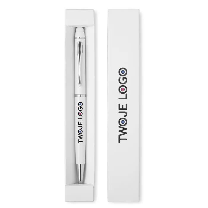 Przekręcany długopis wykonany z aluminium z miękką końcówką do ekranów dotykowych. Niebieski tusz. Indywidualnie pakowany w kartonik.
