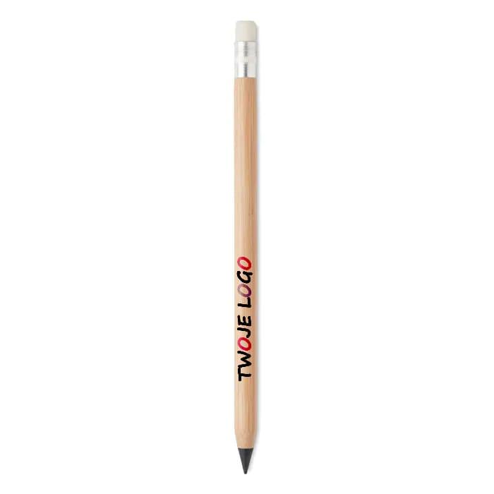 Bambusowy długopis z gumką na górze i z papierową skuwką. Długopis posiada końcówkę ze stopu metalu, która podczas pisania utlenia powierzchnię papieru, nie pozostawiając śladów. To sprawia, że długopis ten jest świetną, zrównoważoną alternatywą dla tradycyjnego długopisu. Bambus jest produktem naturalnym, mogą wystąpić niewielkie różnice w kolorze i rozmiarze każdego elementu, co może wpłynąć na ostateczny efekt dekoracji.