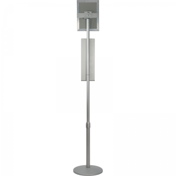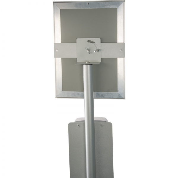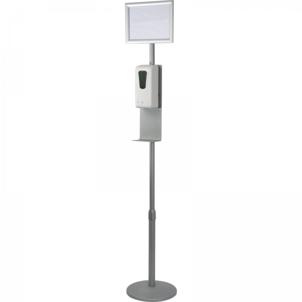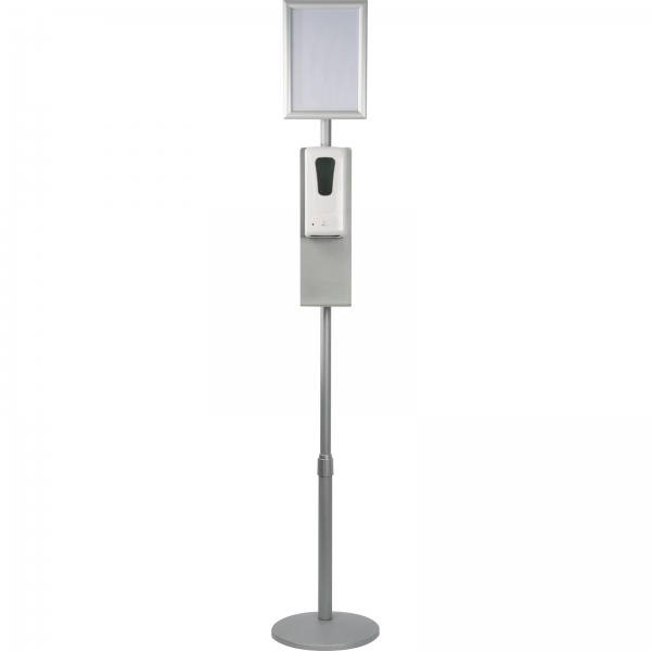 Automatyczny dozownik płynu do dezynfekcji rąk wykonany z metalu. Przymocowany do kolumny o regulowanej wysokości (125-165 cm), z powierzchnią na reklamę o formacie A4 i pojemnikiem na płyn lub żel o pojemności 1000 ml. Zasilany 4 bateriami typu C. Baterie nie są dołączone.