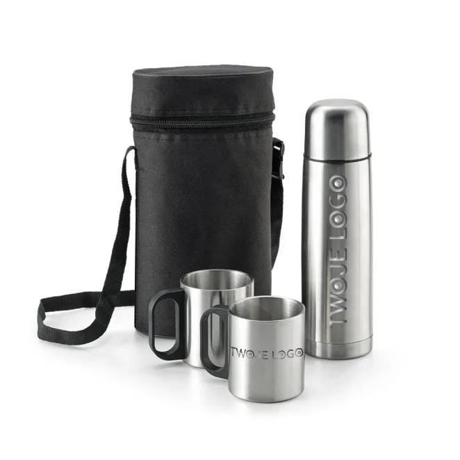 Zestaw - termos i kubki, wykonany ze stali nierdzewnej. W zestawie 2 kubki o pojemności do 200 mL, termos z podwójnymi ściankami o pojemności do 500 mL oraz etui wykonane z 600D z regulowanym paskiem. Torba: 155 x 250 x 90 mm
