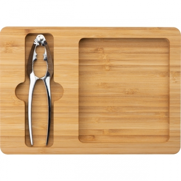 Metalowy dziadek do orzechów z podkładką wykonaną z bambusa.