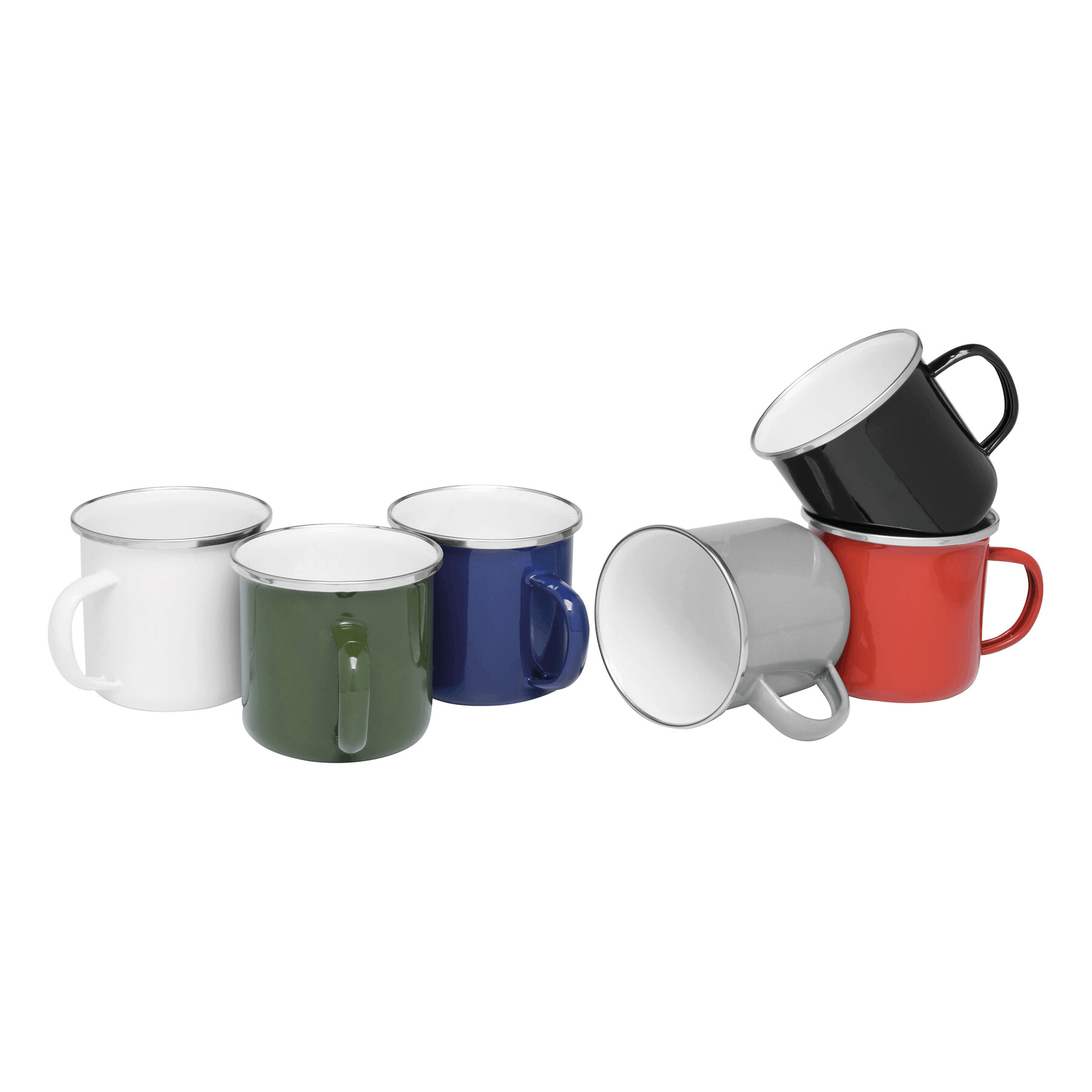 Emaliowany kubek VINTAGE CUP: wykonany z wytrzymałej stali nierdzewnej, z uchwytem, kolorowy na zewnątrz i biały wewnątrz, srebrny brzeg ze stali nierdzewnej, pojemność ok. 350 ml.