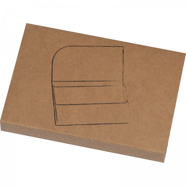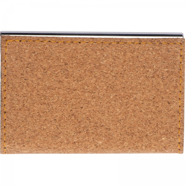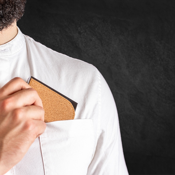 Wizytownik z metalu w korkowej obudowie, zamykany na magnetyczny zatrzask, z materiałową wyściółką.