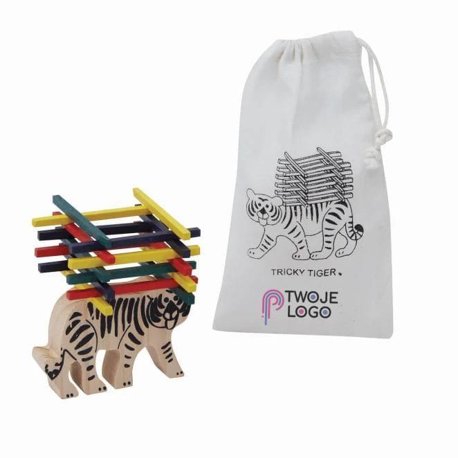 Gra zręcznościowa TRICKY TIGER zawiera drewnianego tygrysa z czarnym nadrukiem, 24 drewniane patyczki w 4 różnych kolorach, instrukcję. Zapakowana w przyjazną środowisku bawełnianą torebkę.