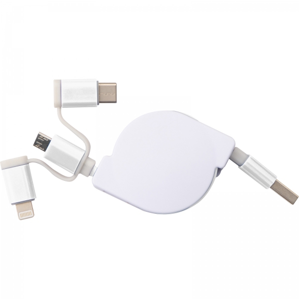 Rozwijany kabel do ładowania 3w1 w plastikowej obudowie z wtyczką USB i 3 złączami: iOS, C-Type i Micro USB.