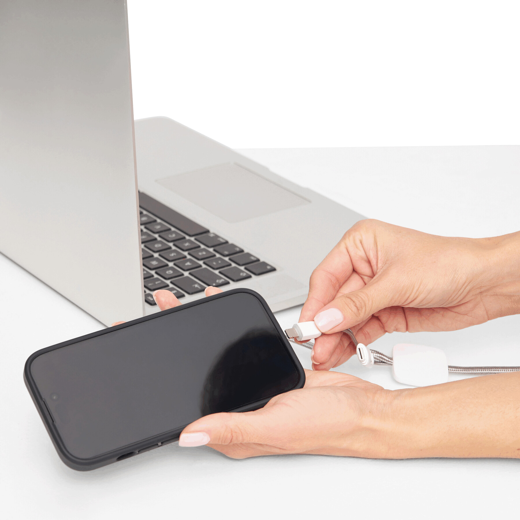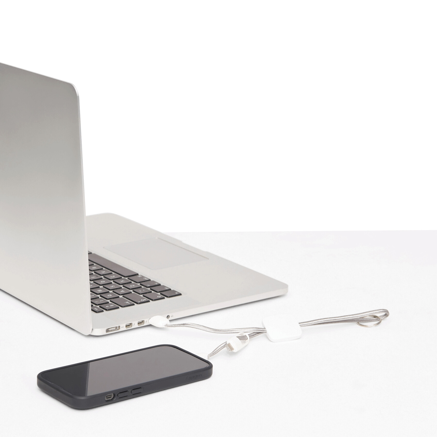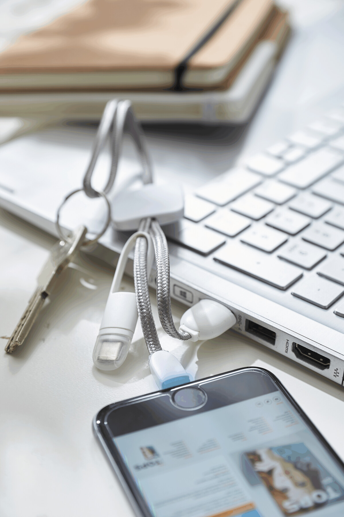 Kabel ładujący ANNOUNCER, z 2 złączami do ładowania urządzeń elektronicznych i smartfonów. Długość ok. 50 cm, z brelokiem na klucze. Wskaźnik zasilania LED zmienia kolor z czerwonego na niebieski po zakończeniu procesu ładowania lub gdy moc ładowania jest niższa niż 0,3 A.