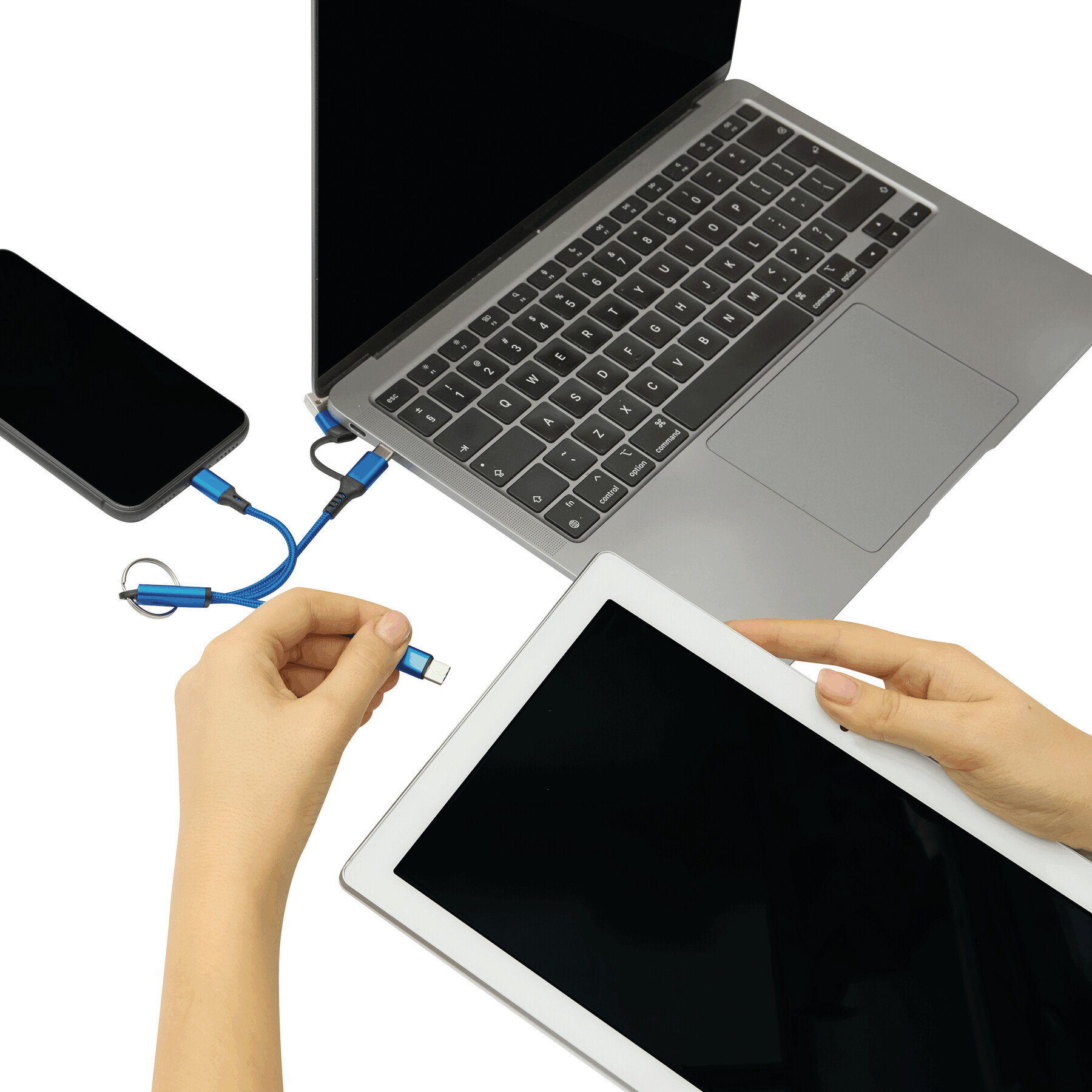 Kabel ładujący FANTAIL do ładowania urządzeń elektronicznych. Ma długość ok. 18 cm oraz breloczek na klucze. Zawiera wtyczkę wejściową USB-C, adapter do USB-A oraz 2 wtyczki do ładowania - USB-C iwtyczkę Micro-USB/Lightning.