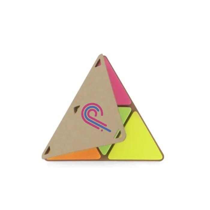 Karteczki samoprzylepne PEL w kształcie trójkąta z ekologiczną papierową okładką. Wewnątrz znajduje się 25 sztuk karteczek w 4 kolorach: pomarańczowym, różowym, zielonym, żółtym.