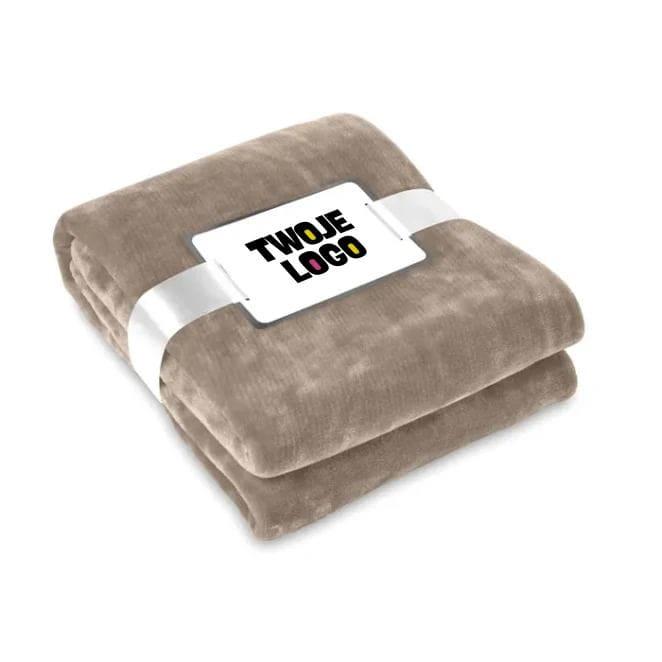 Koc 280g/m² z miłego, miękkiego polaru, przewiązany wstążką, posiada bilecik do nadruku.