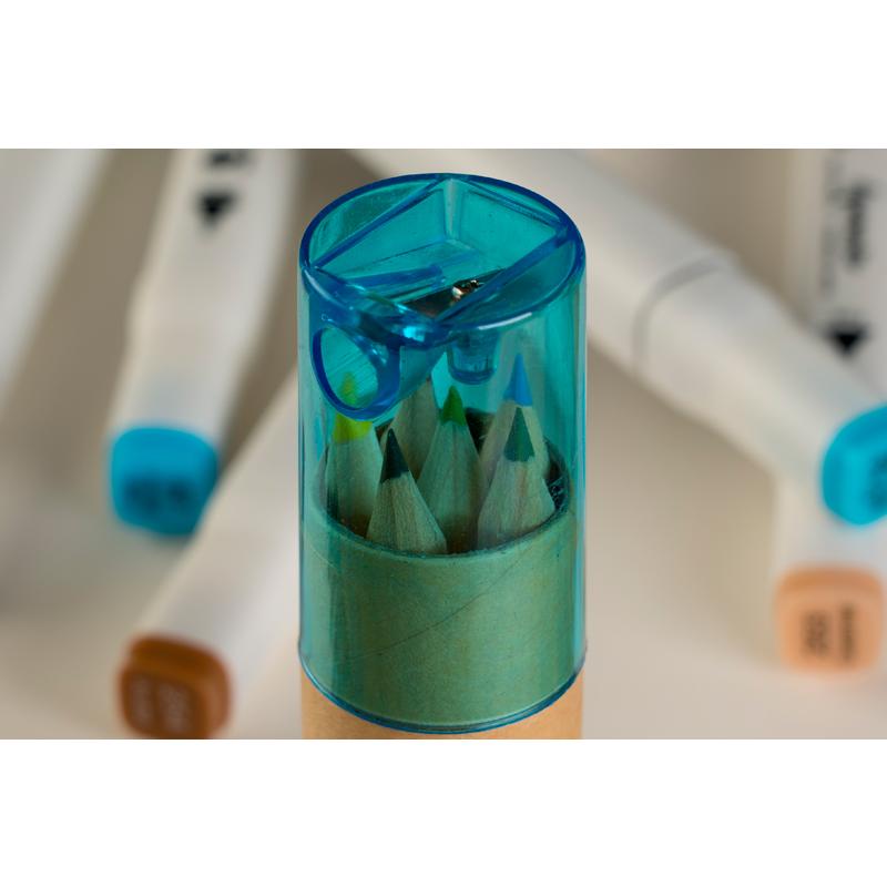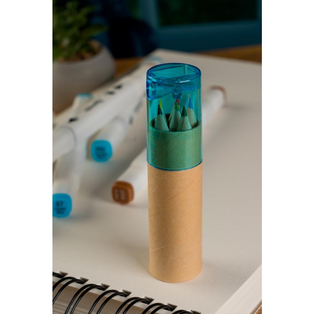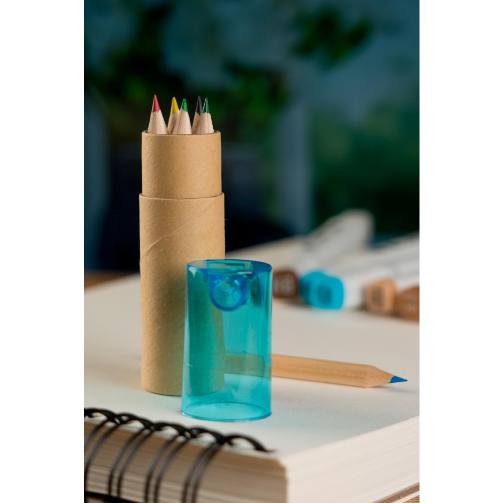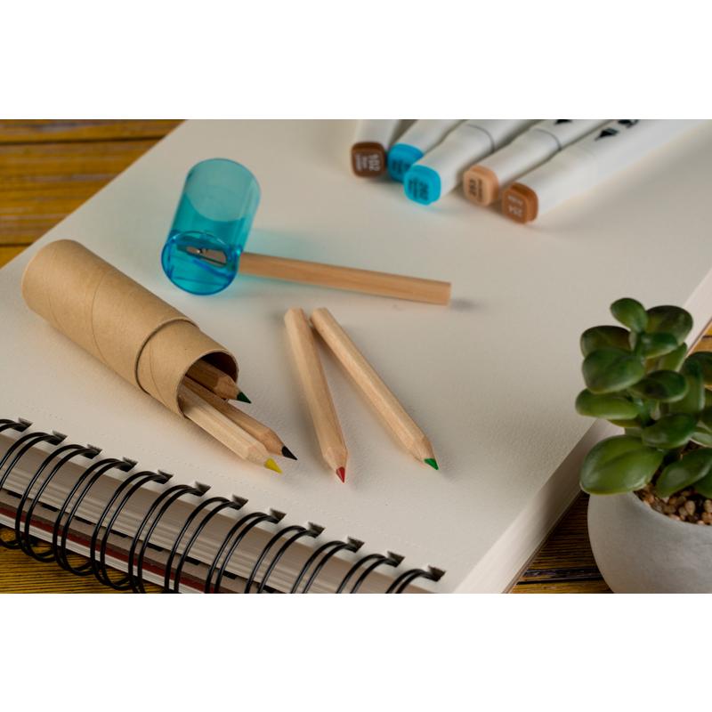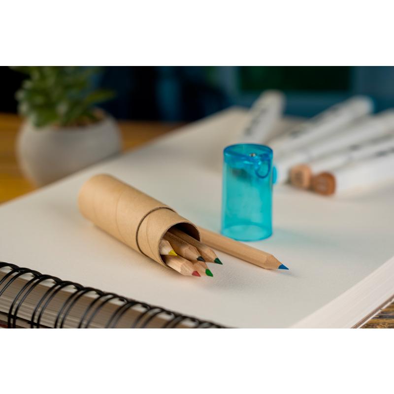 Zestaw kredek drewnianych z temperówką, zapakowany w pudełko z recyklingu. W komplecie 6 kredek w podstawowych kolorach, przeznaczonych do malowania.