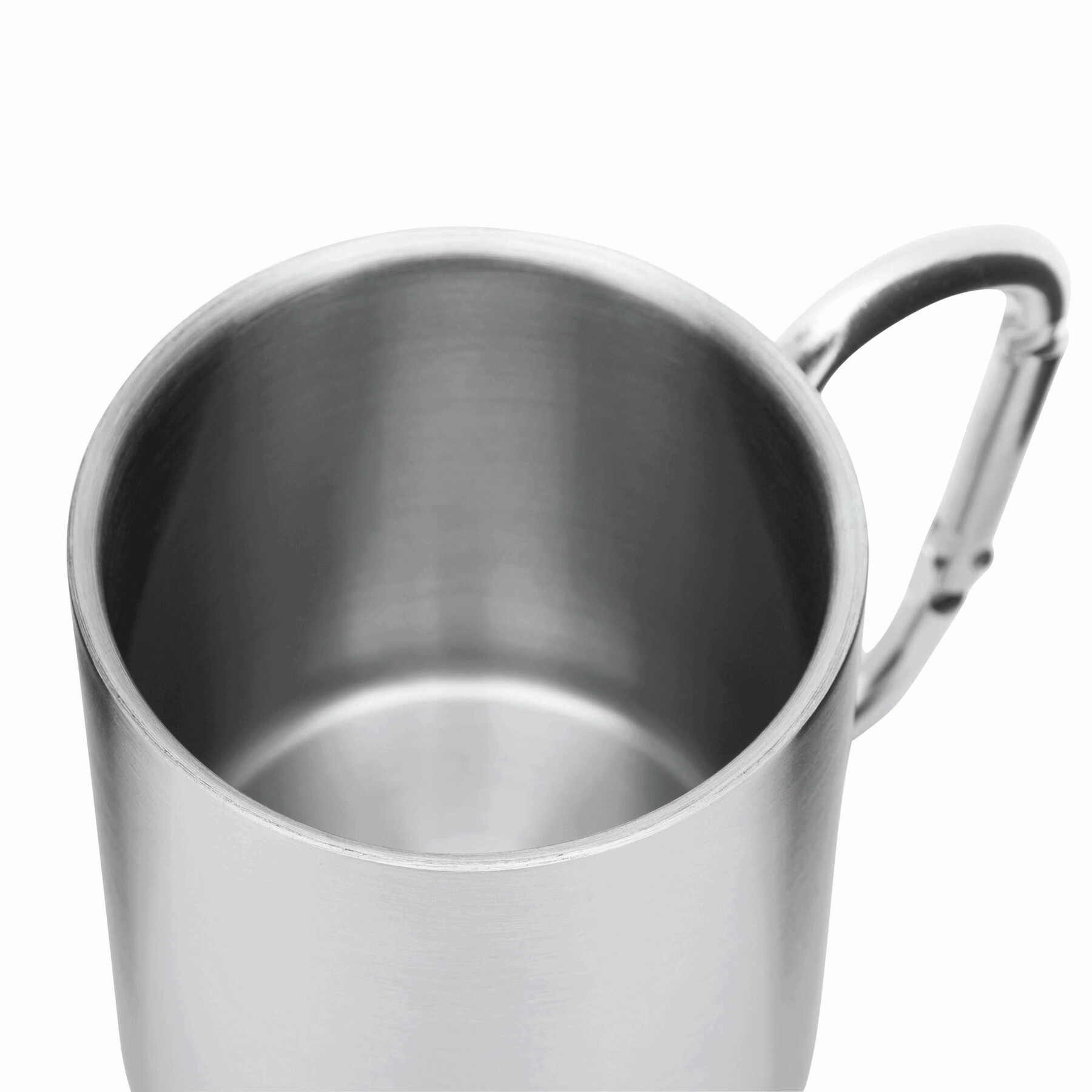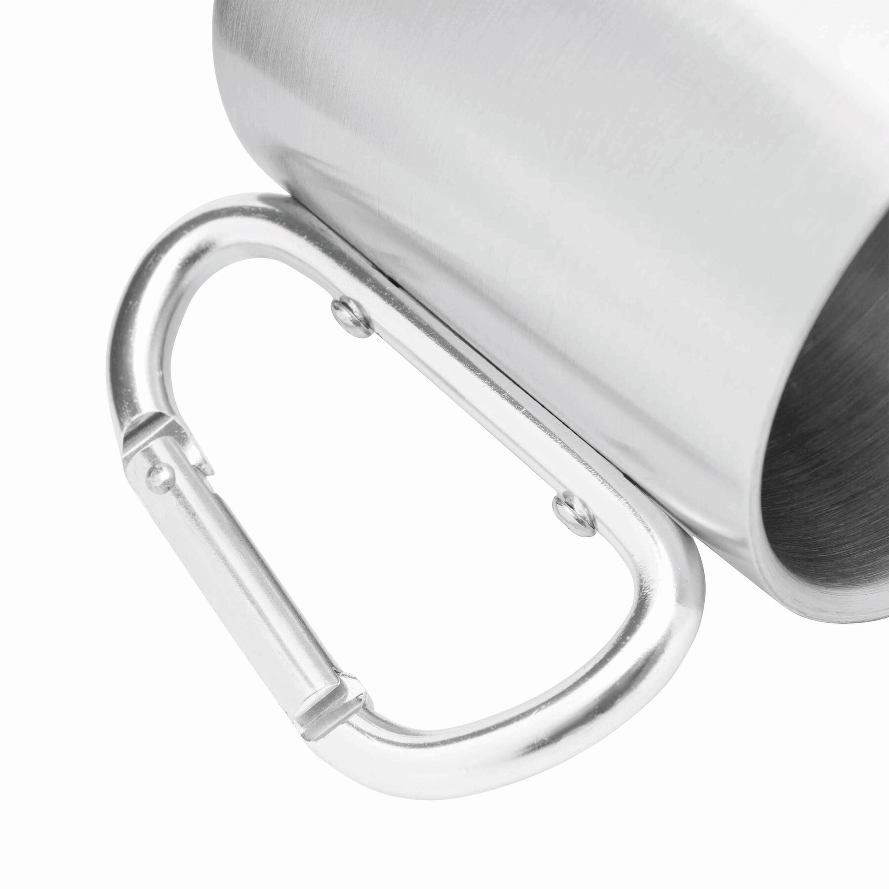 Kubek HIKING DAY ze stali nierdzewnej wewnątrz i na zewnątrz, pojemność ok. 200 ml, z kolorowym karabińczykiem.