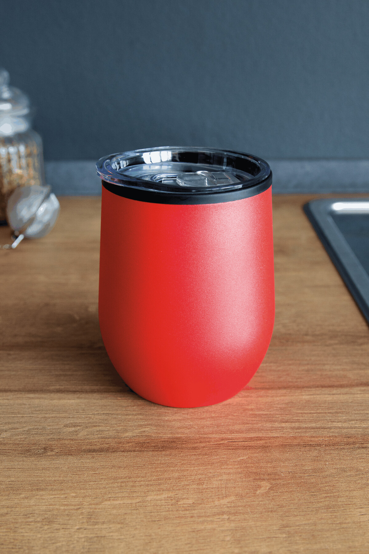 Kubek termiczny BOWLY, podwójne ścianki: z zewnątrz ze stali nierdzewnej, wewnątrz z tworzywa sztucznego, pokrywka z silikonowym o-ringiem i zintegrowanym otworem do picia, pojemność ok. 300 ml