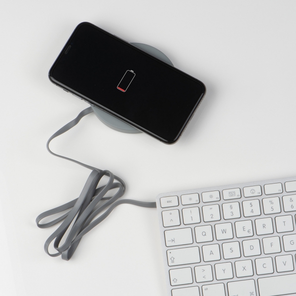 Ładowarka bezprzewodowa w cementowej obudowie z korkową wkładką. Kompatybilna z telefonami z systemem QI.