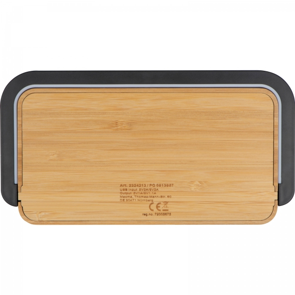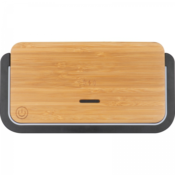 Bambusowa ładowarka bezprzewodowa o mocy 10 wat z lampką. Kompatybilna z urządzeniami z funkcją QI.Urządzenie można wykorzystywać do jednoczesnego ładowania telefonu i jako lampkę nocną.