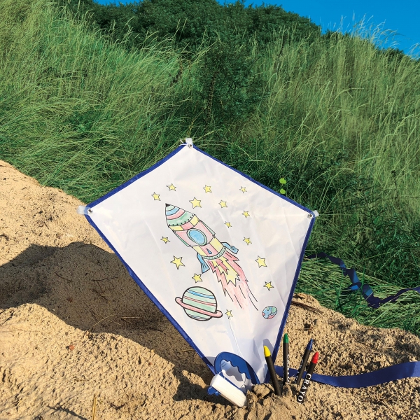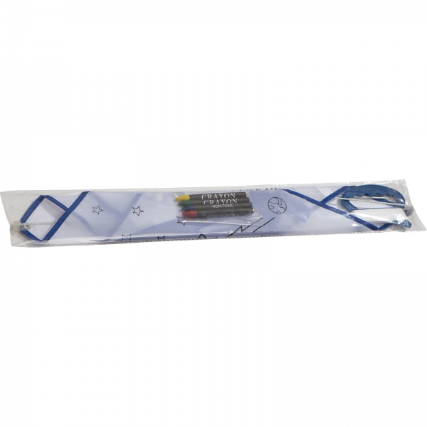 Plastikowy latawiec do kolorowania w zestawie z 4 kredkami świecowymi, wstążką i nylonową żyłką.