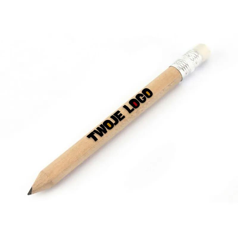 Mini ołówek z gumką, posiada naostrzoną końcówkę, może służyć jako przydatny gadżet dla np. sklepów w branży budowlanej, produkt wykonany z drewna
