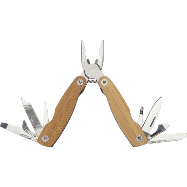 Multinarzędzie w bambusowej obudowie, wyposażone w szczypce, pilnik, śrubokręt płaski, śrubokręt krzyżakowy, nóż itp.