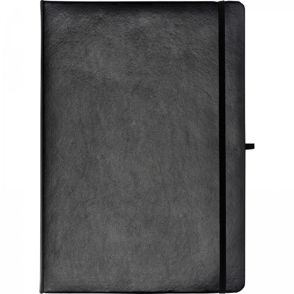 Notes A4 w linie (80 kartek) z okładką z tworzywa sztucznego, zakładką i miejscem na długopis. Zamykany na gumkę.
