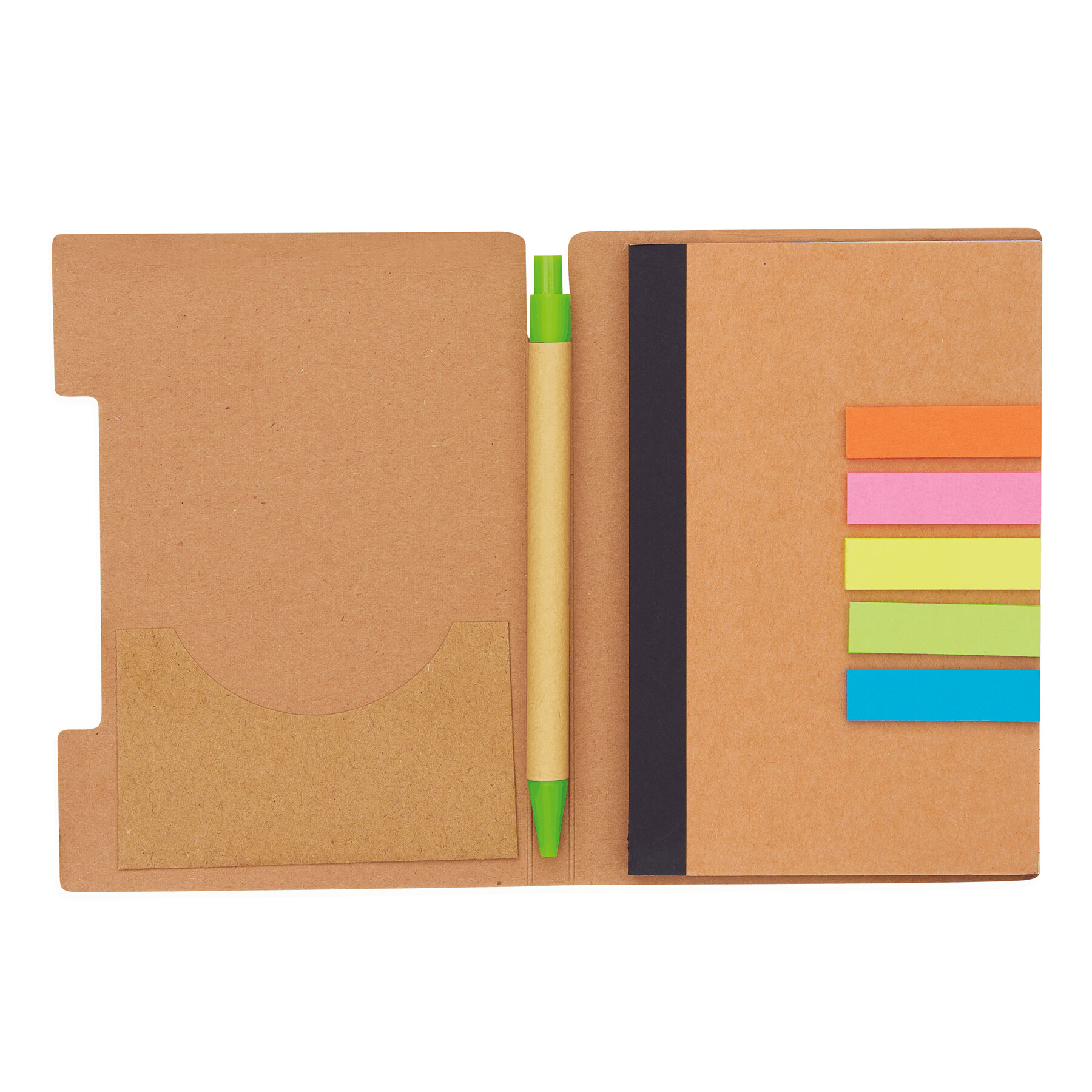 Notes PENZ poręczny, z zaokrąglonymi rogami, zawiera długopis wykonany z tektury (czarny tusz), posiada elastyczną, dopasowaną kolorystycznie gumkę do zamykania, 70 stron, gramatura ok. 70 g/m², 5 różnokolorowych etykiet samoprzylepnych, wykonany z materiałów nadających się do recyklingu.