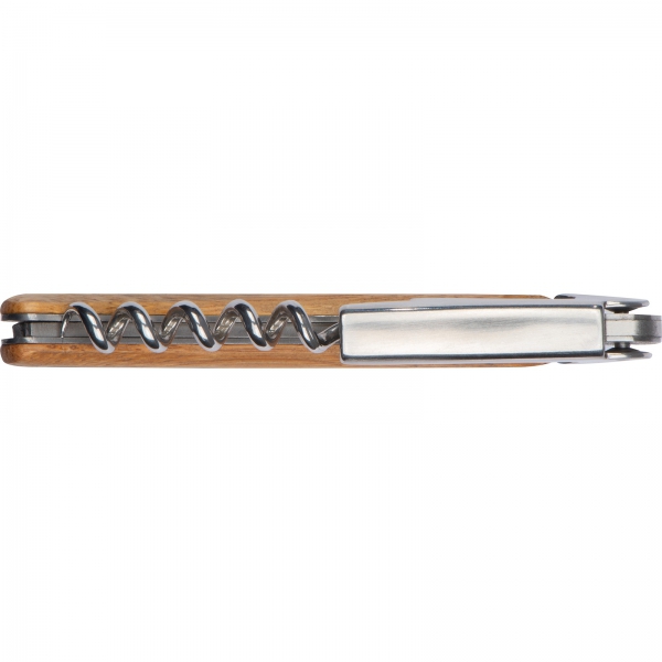 Nóż kelnerski z otwieraczem do butelek, nożykiem do folii i korkociągiem. Noż wykonany z metalu i drewna bambusowego.