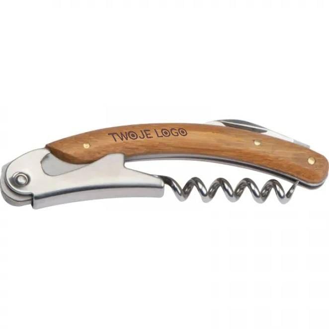 Nóż kelnerski z otwieraczem do butelek, nożykiem do folii i korkociągiem. Noż wykonany z metalu i drewna bambusowego.