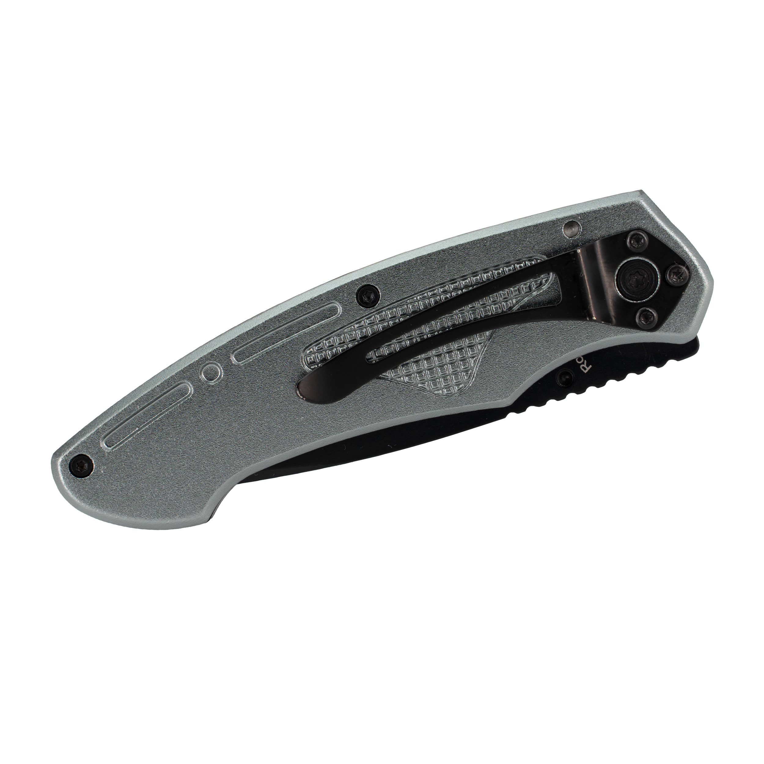 Nóż kieszonkowy wykonany ze stali nierdzewnej z aluminiową rękojeścią i klipsem do mocowania na pasku.