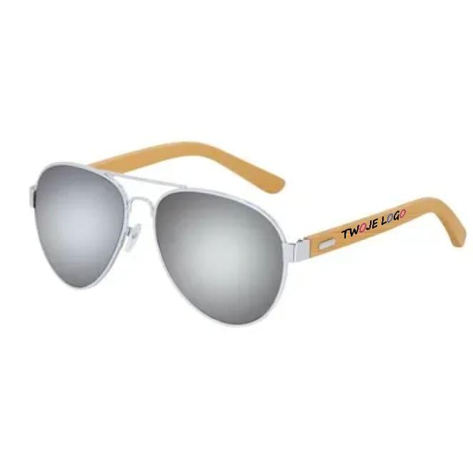 Okulary przeciwsłoneczne z filtrem UV400, posiadają lustrzane szkła oraz bambusowe zauszniki, etui z mikrofibry w komplecie, produkt wykonany z metalu i bambusa