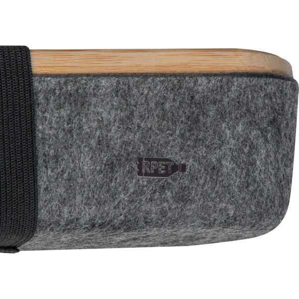 Etui na długopisy wykonane z filcu pochodzącego z recyklingu z bambusową pokrywką, mogącą służyć za podstawkę pod telefon. Pokrywka ma nadrukowaną miarkę. Etui po nałożeniu pokrywki i spięciu gumką może służyć za piórnik.