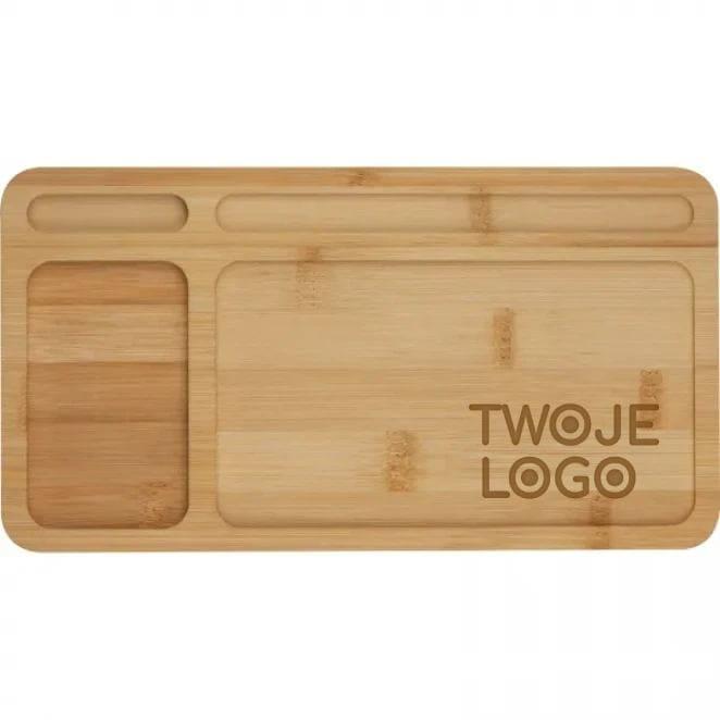 Bambusowy organizer na biurko z uchwytem na smartfona, bezprzewodową ładowarką i miejscem na przybory biurowe. W zestawie kabel ładujący USB.