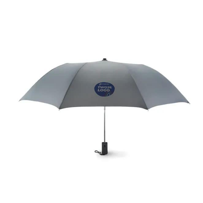 Parasol 21cali, otwierany automatycznie, składany na 2. Wykonany z wysokiej jakości poliestru pongee 190T, trzon, żebra i końcówki ocynkowane. Czarna gumowana rączka z ABS. Posiada dopasowane etui. Zamykany manualnie.
